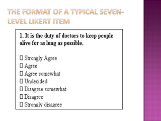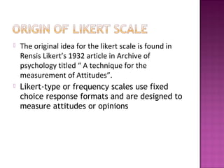 The Likert scale, introduced by Rensis Likert in 1932, is a widely used psychometric scale for measuring attitudes or opinions through fixed-choice responses. This one-dimensional scaling technique allows respondents to express varying levels of agreement or disagreement, facilitating data collection and analysis in surveys. However, its implementation may lead to biases, with participants potentially influenced by previous questions or their feelings towards the surveyor.