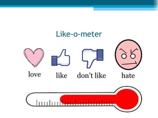 The document discusses different likes and dislikes related to food, activities, and hobbies. It provides examples of sentences expressing preferences for eating different foods or doing various activities. Users are prompted to make their own sentences about activities and to find people with specific likes and dislikes.
