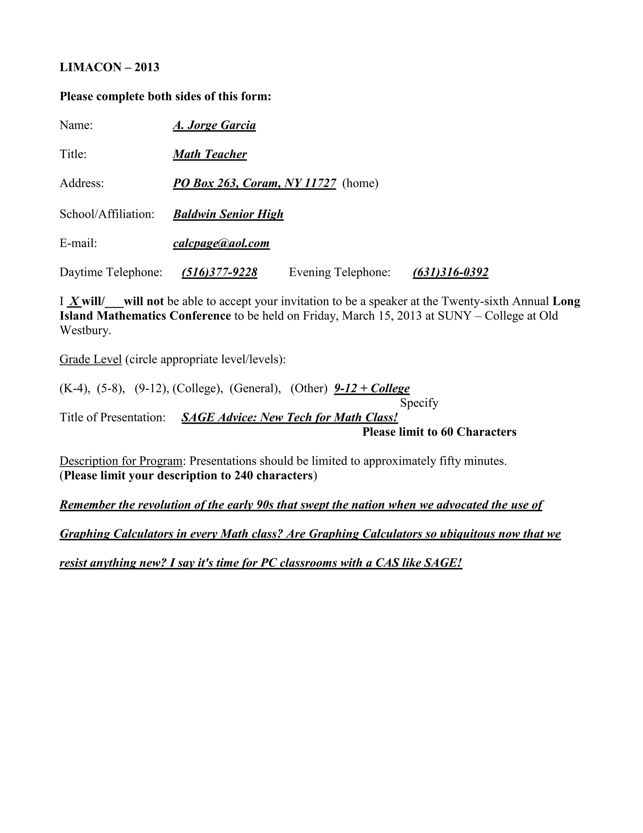 A. Jorge Garcia, a math teacher at Baldwin Senior High, has submitted a form to be a speaker at the Twenty-sixth Annual Long Island Mathematics Conference on March 15, 2013. His proposed presentation is titled "SAGE Advice: New Tech for Math Class!" and would advocate for the use of PC classrooms with symbolic algebra software like SAGE, arguing that graphing calculators are now ubiquitous and it's time to adopt new technology. He recommends fellow Baldwin Senior High teacher George Drakatos as a future speaker for the conference.