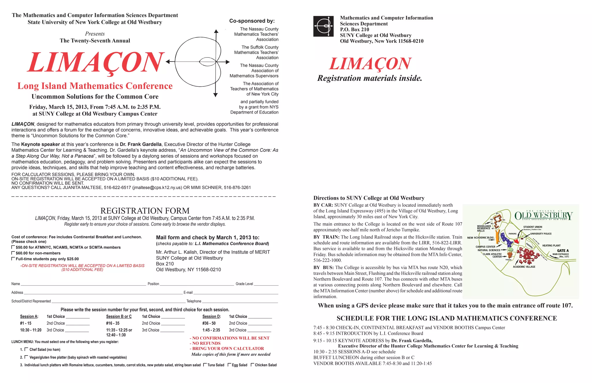 This document provides information about the Twenty-Seventh Annual Long Island Mathematics Conference to be held on March 15, 2013 at SUNY College at Old Westbury. The half-day conference will feature keynote speaker Dr. Frank Gardella discussing "An Uncommon View of the Common Core: As a Step Along Our Way, Not a Panacea". Participants can choose from over 40 sessions focusing on mathematics education, pedagogy, and problem solving aligned with the Common Core Learning Standards. Registration materials are included in the document.