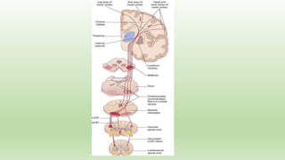 The document discusses upper motor neuron lesions, specifically focusing on the cortico-spinal tract's anatomy, function, and the resulting clinical features of lesions. It highlights how weaknesses in limb movements manifest and the various patterns of weakness based on the location of the lesions, along with diagnostic approaches and treatment options. Additionally, it covers the muscle strength grading scale and different types of paresis, as well as the significance of understanding lesion localization for effective diagnosis and management.