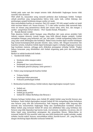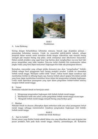 Dokumen ini membahas tentang limbah, baik dari industri maupun rumah tangga, yang dapat mencemari lingkungan dan berbahaya bagi kesehatan. Ditekankan pentingnya pengolahan limbah dengan metode yang tepat untuk mengurangi dampak negatif dan memanfaatkan kembali limbah anorganik. Tujuannya adalah untuk mengurangi pencemaran dan menciptakan solusi kreatif bagi pengelolaan limbah, termasuk daur ulang dan pemanfaatan material limbah sederhana.
