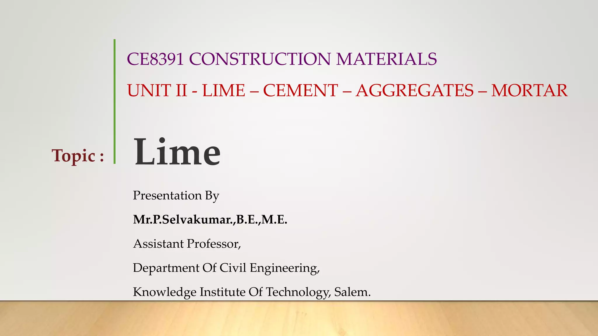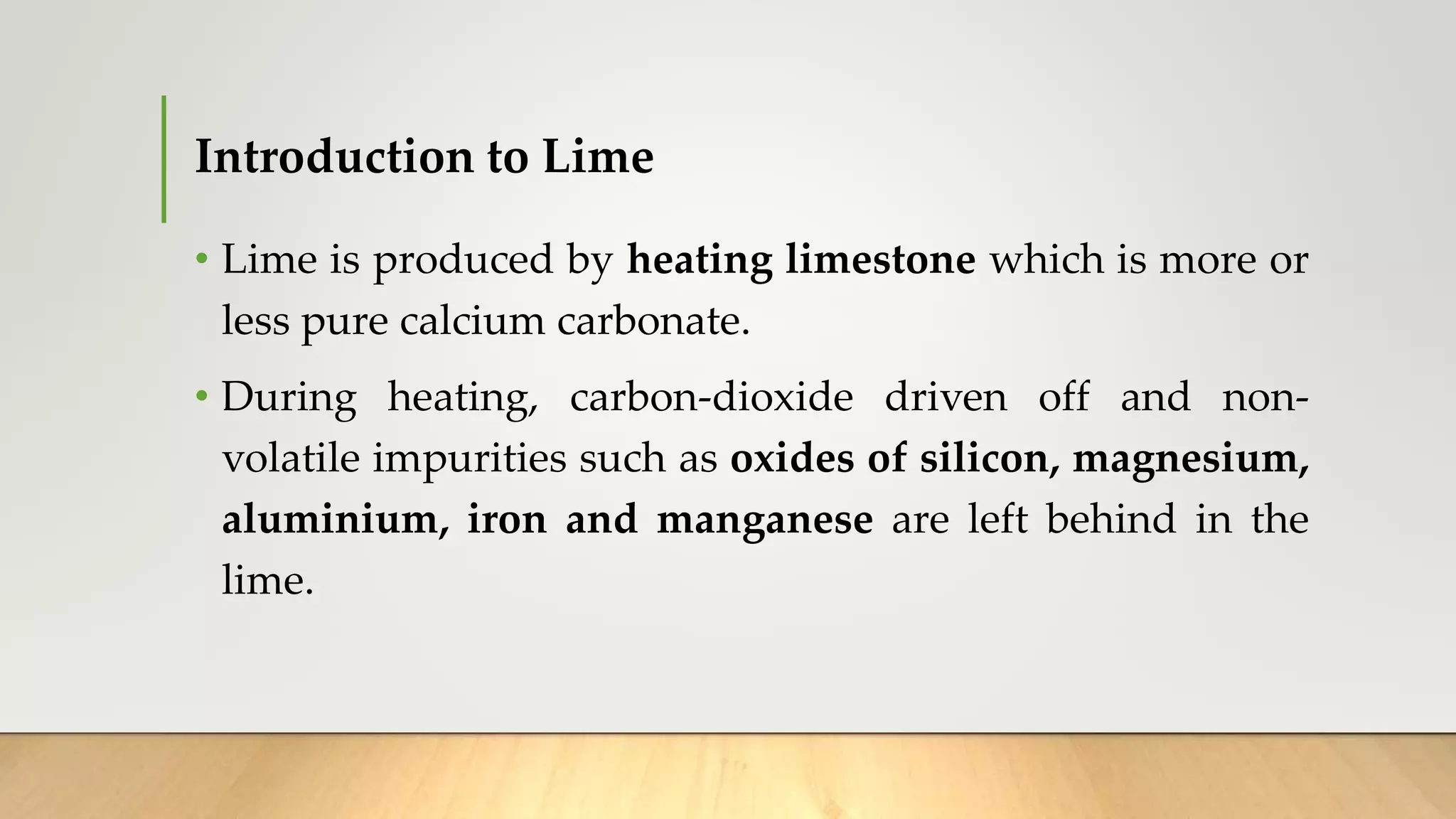 This document provides an overview of lime as a construction material. It discusses the production of lime by heating limestone, resulting in calcium oxide. Lime is classified as fat lime, hydraulic lime, or poor lime depending on clay content. Fat lime contains 95% calcium oxide and is used for plastering and thin mortar joints. Hydraulic lime sets under water due to clay content and is divided into feebly, moderately, and eminently hydraulic types. Poor lime contains over 30% clay, slakes slowly, and has poor binding properties. The document also defines relevant technical terms and classifications of lime according to the ISI.