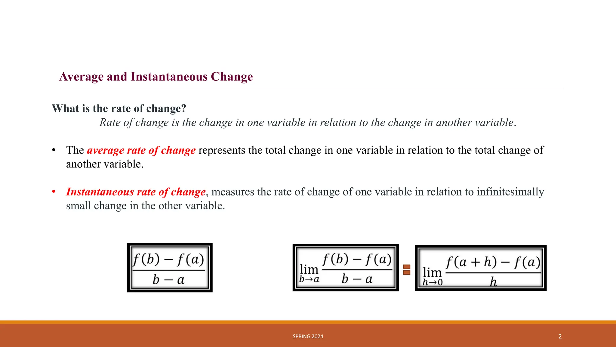 - Average rate of change, which represents total change over total change
