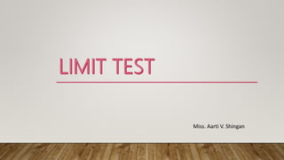 The document discusses various limit tests designed to detect impurities in substances, focusing on tests for chloride, sulphate, iron, lead, arsenic, and heavy metals. Each test is based on specific chemical reactions and procedures to determine if the impurity levels exceed acceptable standards, often through comparative observations of color or turbidity. The document details the principles, procedures, observations, and reasons for each test, emphasizing the importance of maintaining precise conditions and using standard solutions for accurate results.
