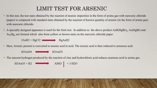 This document describes the limit test for arsenic using the Gutzeit method. Arsenic in a sample is converted to arsine gas, which reacts with mercuric chloride paper to produce a stain that is compared to a standard stain. The test uses an apparatus with two glass tubes, where the sample is placed below zinc and hydrochloric acid to produce arsine gas, which passes through mercuric chloride paper to produce a stain after 40 minutes. By comparing the intensity of this test stain to the standard stain produced in the same way from a solution of known arsenic concentration, the document determines if the sample passes or fails the limit test for arsenic.