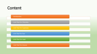 The document discusses various limit tests used to detect inorganic impurities in pharmaceutical substances, including tests for chlorides, sulphates, iron, lead, and arsenic. Each test is based on chemical reactions that produce observable changes, allowing for a pass/fail evaluation against standard solutions. It also outlines the procedures for conducting these tests, highlighting the importance of certain reagents and conditions for accurate results.