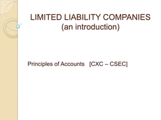This document provides an introduction to limited liability companies. It defines a limited liability company as a business structure where owners are only liable up to their investment. It discusses the two types of limited liability companies - public and private. Public companies must meet minimum shareholder, capital, and reporting requirements, while private companies have fewer requirements. The document outlines the management, capital structure as shares, types of shares, how dividends are paid, use of debentures, and key accounting aspects like the income statement, appropriation of profit, and balance sheet presentation for a limited liability company.