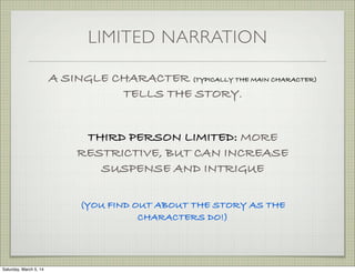 The document discusses different types of narrative styles in literature, including limited and omniscient narration. It explains how these styles affect storytelling, detailing specific narrator types like detached observers, commentators, interviewers, secret characters, and unreliable narrators. Examples from classic literature illustrate each type, emphasizing the role of the narrator in shaping a reader's understanding of the story.