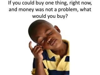 This document discusses limited resources and how people must make choices due to scarcity. It provides examples of limited resources like movie theater seats, money to purchase a bike, water, and oil. Because resources are limited and many people want them, individuals must decide how to spend their limited money and which resources to prioritize when not everyone can have or do everything they want.