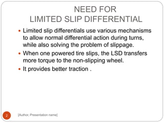This presentation discusses limited slip differentials. It begins by explaining the need for limited slip differentials and how they transfer more torque to the non-slipping wheel when one powered tire slips. It then discusses the basics of how a limited slip differential works, explaining that it prevents excessive power from being allocated to the slipping wheel. The presentation goes on to describe the different principles and mechanisms by which limited slip differentials operate and distribute torque between the wheels, such as viscous couplings or clutch packs. It also outlines several common types of limited slip differentials, such as viscous, helical, torque-sensitive, and clutch-type differentials.