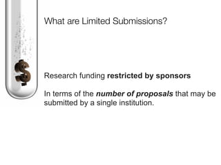 The document summarizes the development of a new system for managing limited submission research funding opportunities at the University of Washington. It describes limited submissions as research funding restricted by sponsors in terms of the number of proposals an institution can submit. It outlines two phases of development: phase 1 involved maintaining underlying data in a new mechanism, while phase 2 added a graphical user interface and data enhancements. Testing showed the new system met performance and user expectations, resulting in a successful replacement of the old administrative interface and campus site.