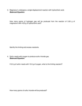 The document is a chemistry worksheet that contains 4 chemistry reaction problems. The problems involve identifying limiting and excess reactants given the amounts of substances available to react. The student must show their work and calculations to receive credit for answering what amounts of products will be formed based on the limiting reactants.