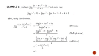 The document discusses limits of functions and how to evaluate them. It explains that a limit describes the behavior of a function as its variable approaches a constant value. To evaluate a limit, tables of values are constructed showing the outputs of the function for inputs very close to the constant. The limit is the unique value the outputs approach. Examples demonstrate evaluating limits by constructing tables and interpreting the results.