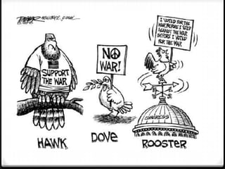 This document discusses various checks on presidential power in the US system of government. It outlines both formal checks found in the Constitution, such as Congress's powers to make laws, declare war, and impeach the president. It also discusses informal checks like public opinion, the media, partisan politics. The document then focuses on debates around Congress's power to declare war and limitations placed by the War Powers Resolution of 1973.