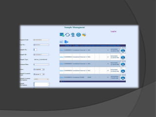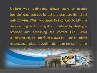The document outlines a Laboratory Information Management System (LIMS) that allows users to manage lab samples and data via a web browser after authentication. Developed by SHCT information technology students, the LIMS automates workflows, enhances efficiency, and allows for user login and sample management across various sectors. Key features include user account management, request management, sample management, and result viewing capabilities.