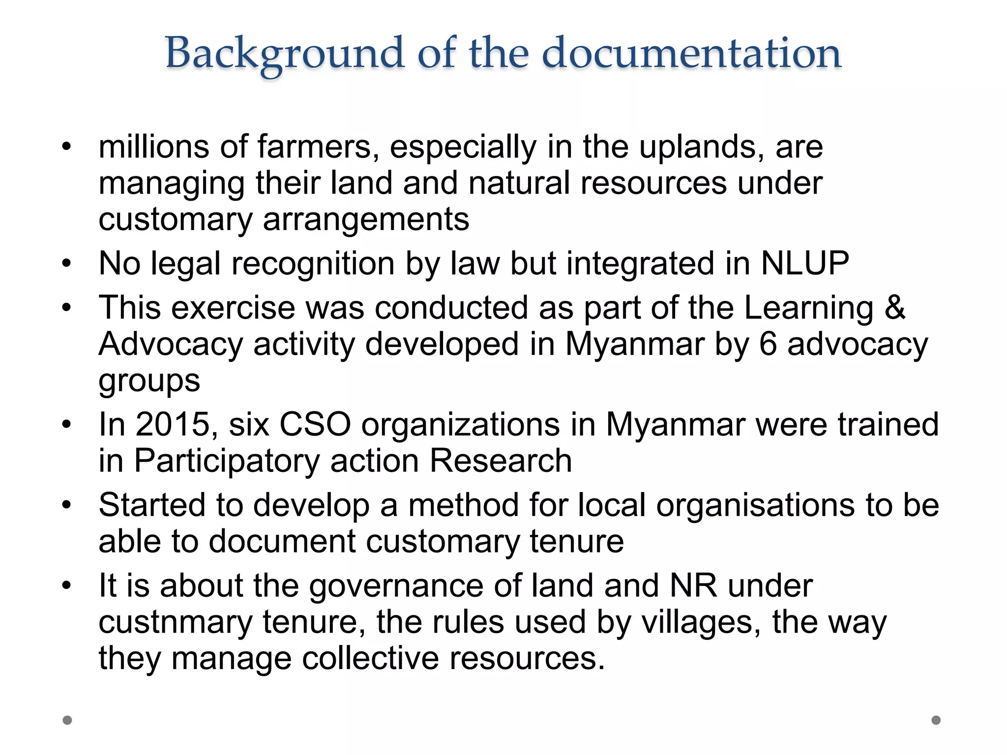 This document summarizes the findings of a study documenting customary land tenure practices in Sar Pauk Village, Myanmar. The study involved conducting focus groups and interviews with villagers over multiple trips to understand how they govern and allocate land and natural resources. Key findings include that villagers have equal access to rotational farming lands and forests, land is managed communally and not for commercialization, and they employ sustainable land and resource practices. However, challenges exist such as lack of legal recognition of their customary tenure system and threats from illegal logging and potential land acquisitions.