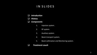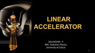 Linear accelerators use microwave technology to accelerate electrons, which are then collided with a heavy metal target to produce high-energy photons. The photons are shaped and directed to the patient's tumor. The main components of a linear accelerator include the injection system to produce electrons, the RF system to accelerate the electrons, auxiliary systems, beam transport to deliver electrons to the target, and beam collimation and monitoring systems to shape and measure the photon beam. Linear accelerators have gone through several generations with improvements like higher photon energies, computer control, dynamic wedges, and intensity modulated radiation therapy.