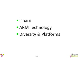 Linaro is a not-for-profit engineering organization with over 120 engineers that leads open source software development for ARM technology. It works to help its members optimize Linux and other open source software to bring high-quality products to market quickly. Some of Linaro's achievements include contributions to the Linux kernel, developing the Linaro ARM GCC toolchain, and setting up continuous integration and testing systems. Linaro also works to upstream its optimizations and ensure they are included in the mainline Linux kernel.