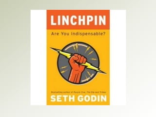 This document summarizes key points from a book about becoming an indispensable employee or "linchpin". It discusses how average workers are easily replaced and underpaid, while linchpins bring unique value that is difficult to replace. It encourages readers to think differently and use their creativity to solve problems rather than just following instructions. It also addresses the mental resistance people have to standing out and challenges assumptions about jobs and career success.