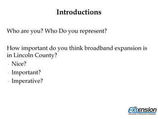 This document summarizes a presentation about broadband expansion in Lincoln County. It discusses the importance of broadband, current broadband speeds and adoption rates, efforts in other Wisconsin communities to expand broadband like in Door County and the Chippewa Valley, and how the Center for Community Technology Solutions can help Lincoln County with broadband planning.