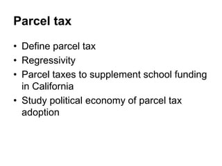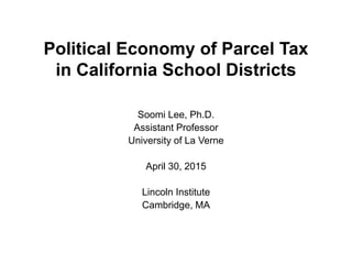 This document summarizes a study on the political economy of parcel taxes adopted by California school districts. It finds that parcel taxes have increased as a way for districts to supplement school funding after property tax limits were passed. Between 1983-2014, about 13% of districts passed a parcel tax. The number of districts and revenue from parcel taxes has risen steadily since 2003. Previous studies have looked at factors like costs of schooling and political ideology but not the redistributive effects. This study aims to fill that gap using a political economic perspective and matching method to compare parcel tax measures to school construction bond measures.