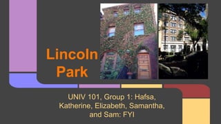 Lincoln Park is a neighborhood located north of downtown Chicago. It is bounded by Lake Michigan, the Chicago River, and Diversey Parkway. The area has a long history, starting as a cemetery in the 1830s before becoming a park named after Abraham Lincoln in 1865. Today, Lincoln Park is known for its boutiques, cafes, restaurants, and nightlife along Clark Street and Armitage Avenue. It is also home to attractions like the Lincoln Park Zoo and nature museums.