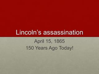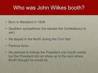 John Wilkes Booth was a famous Southern sympathizing actor who assassinated President Abraham Lincoln at Ford's Theatre on April 14, 1865, five days after the end of the Civil War. Booth shot Lincoln in the back of the head during a performance of "Our American Cousin" and escaped, but broke his leg in the process. After a two-week manhunt, Booth was found hiding in a Virginia barn by the Union Army and was shot and killed there on April 26th.