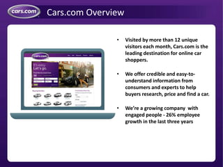 This document discusses how Cars.com is adapting its marketing approach to address challenges in a complex digital sales environment. It summarizes research on different sales profiles and advocates adopting a "Challenger" mindset that challenges customer assumptions to catalyze action. The document outlines Cars.com's shift to a Challenger model of marketing using varied content, data/analytics, and coordinated efforts across sales, training, and marketing. It provides examples of how this approach increased engagement metrics and revenue. Key learnings emphasized establishing an integrated process first within marketing and across stakeholders.