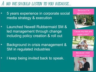 The document provides tips for using social media effectively for businesses. It recommends 5 things: 1) Listen to your community to understand their interests. 2) Set clear goals, strategies, and plans for social media use. 3) Choose a social media team wisely by finding those who understand your brand and are passionate about social media. 4) Create a social media policy to guide appropriate use. 5) Provide ongoing training to your social media team to ensure best practices.