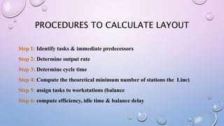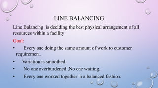 This document discusses the process of line balancing, which is determining the optimal physical arrangement of resources in a facility. The goal is to balance the workload so that each worker performs the same amount of work and no one is overburdened or waiting. The procedure involves identifying tasks and predecessors, determining the output rate, calculating cycle time, computing the minimum number of stations needed, assigning tasks to stations while ensuring the time at each station does not exceed the cycle time, and computing efficiency and idle time. An example of applying these steps to Vicki's Pizzeria is provided.