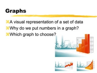 This document discusses different types of graphs, including line graphs, bar graphs, and pie charts. It describes when each graph type is most appropriate based on the data being visualized. Line graphs are best for comparing values over time, while bar graphs compare values across categories. The document also provides examples of correctly formatted line plots and instructs students to complete worksheets to practice creating different graph types.