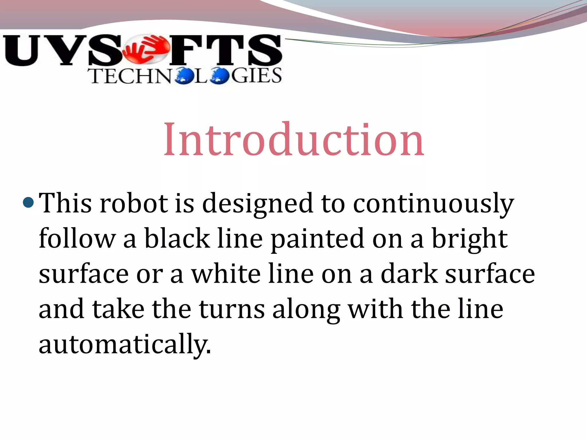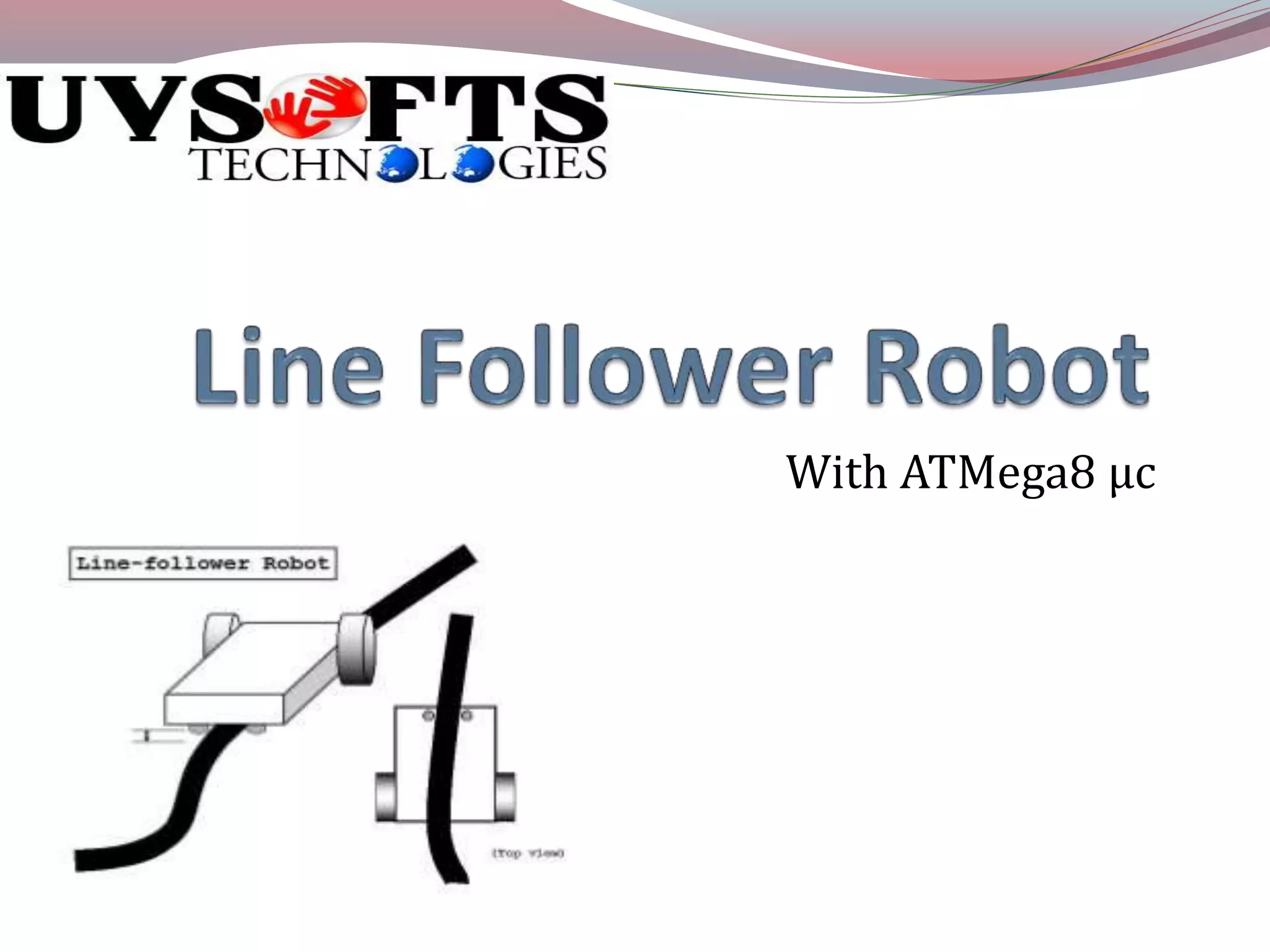 This document describes the design of a line-following robot that uses an ATMega8 microcontroller. The robot uses IR sensors to detect a black or white line and follow it, taking turns automatically. It includes IR sensors, a comparator IC, motor driver IC, DC motors, and a microcontroller board to process sensor input and control the motors accordingly to follow the line. The robot is able to detect the line with the IR sensors, send the sensor signals to the microcontroller via comparators, and have the microcontroller turn the appropriate motor on or off to steer the robot along the line.