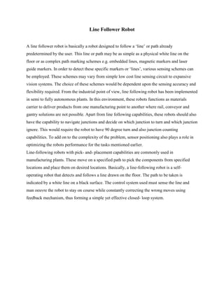 A line follower robot is designed to follow a predetermined path marked by a physical line or other markers. Various sensing schemes can detect these markers, ranging from simple low-cost line sensors to complex vision systems. Line follower robots are commonly used in manufacturing plants to move along specified paths and pick up and place components. They work by using sensors to detect the line path and feedback mechanisms to stay on course while correcting deviations.