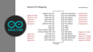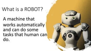 The document summarizes the components and functioning of a line following robot. It consists of an Arduino board as the brain, two IR sensors to detect the line, a motor driver IC and two DC motors for movement. The IR sensors detect the line and send signals to the Arduino, which uses the motor driver IC to control the motors' direction - forward when both sensors detect the line, right when the left sensor doesn't, and left when the right sensor doesn't. Key components are the Arduino, IR sensors, motor driver IC and DC motors.