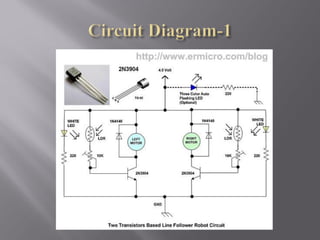 This document outlines a semester project to build a line-following robot. It will use discrete electronic components like light dependent resistors and transistors to sense a white line on a black surface and motors to maneuver along the line. The project will have modules for mechanical design, motor control, and light sensing. It provides details on the components, circuit design, team responsibilities, timeline and potential risks.