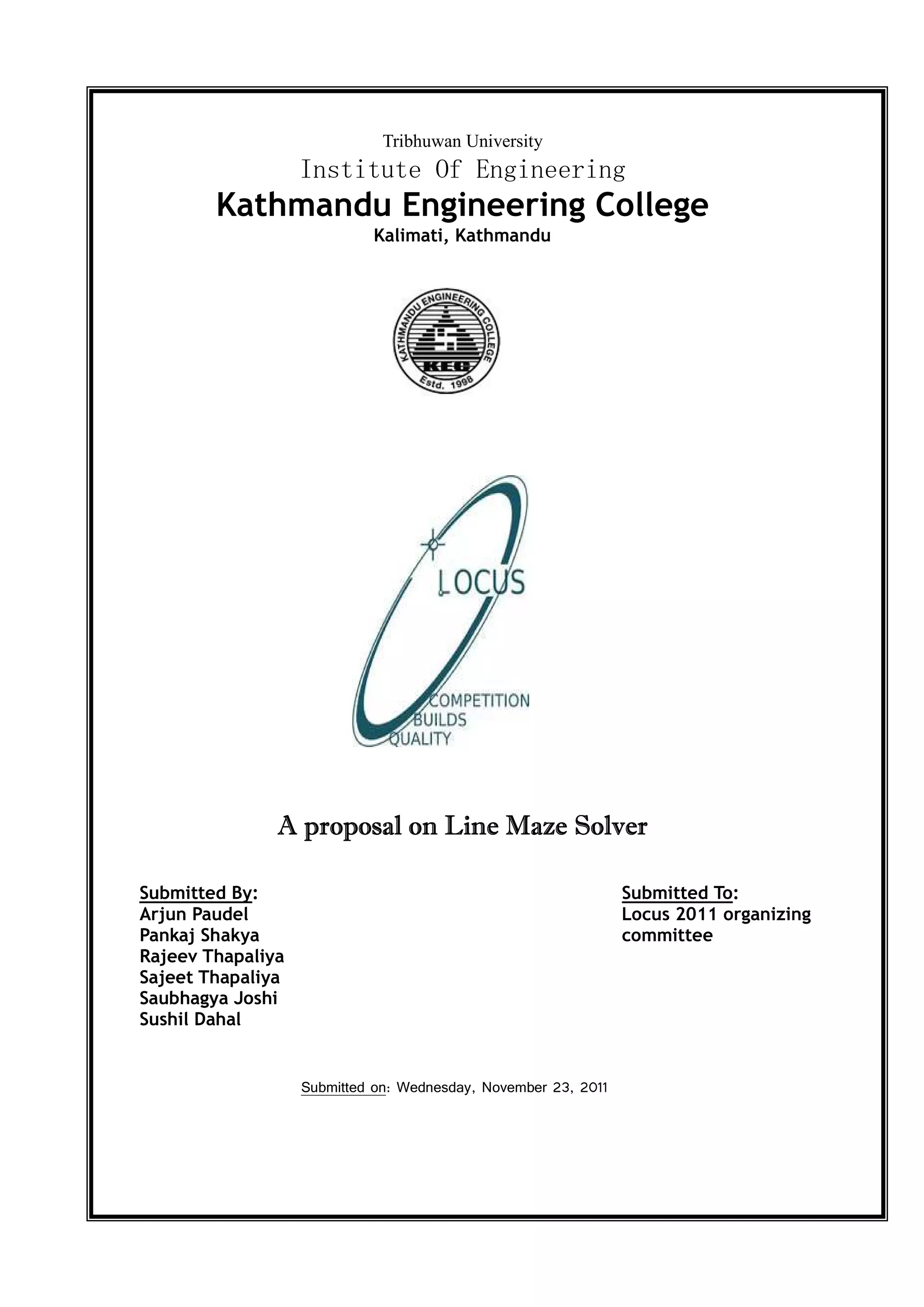 The document describes a proposal for a line maze solver robot project. It includes an introduction to line mazes, the objectives of the project to build an autonomous robot that can solve a line maze, and the key components and methodology. The robot will use 6 light sensors to detect the black line on a white surface and make decisions at intersections. It will use an Arduino microcontroller to process sensor input and control the motors. The first run will record wrong turns to avoid on the second run when it can solve the maze quickly.