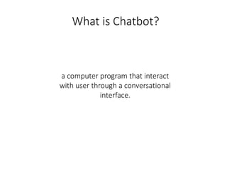 A chatbot is a computer program that interacts with users through conversational interfaces such as messengers. Chatbots can serve large numbers of people compared to human staff, do not require new applications or learning new interfaces, and chat platforms are gathering places for potential customers. There are two main types of chatbots - conversational chatbots that understand and process human natural language through natural language understanding and processing, and transactional chatbots that focus on command-based interactions and simplifying interactions to perform specific actions.