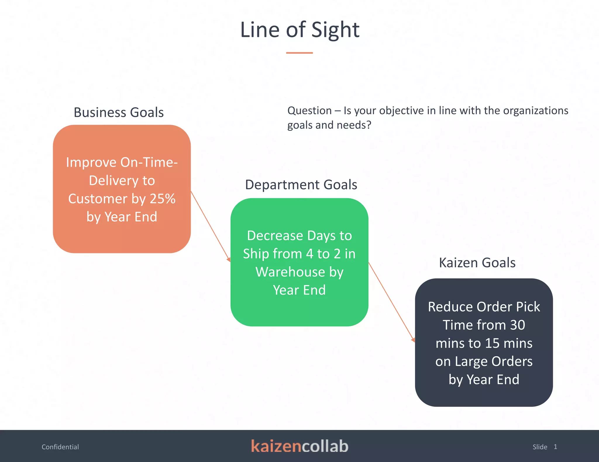 This document outlines the goals and objectives of different departments to improve the overall business goal of increasing on-time delivery to customers by 25% by the end of the year. The warehouse department goal is to decrease the days to ship items from 4 to 2 days. The production department goal is to increase parts produced per hour from 300 to 550. A kaizen goal is to reduce the time it takes to pick large orders from 30 minutes to 15 minutes. The document ensures departmental goals are aligned to support the overall business objective.