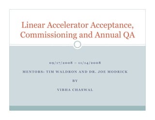 This document summarizes the expectations and key learnings from a linear accelerator acceptance, commissioning, and annual QA training that occurred from September to November 2008. The training covered: