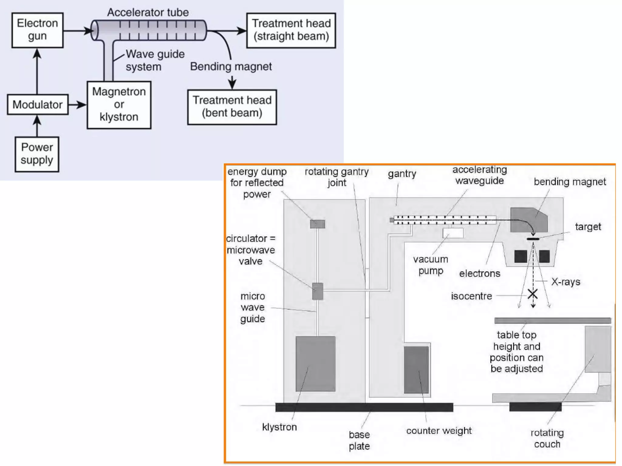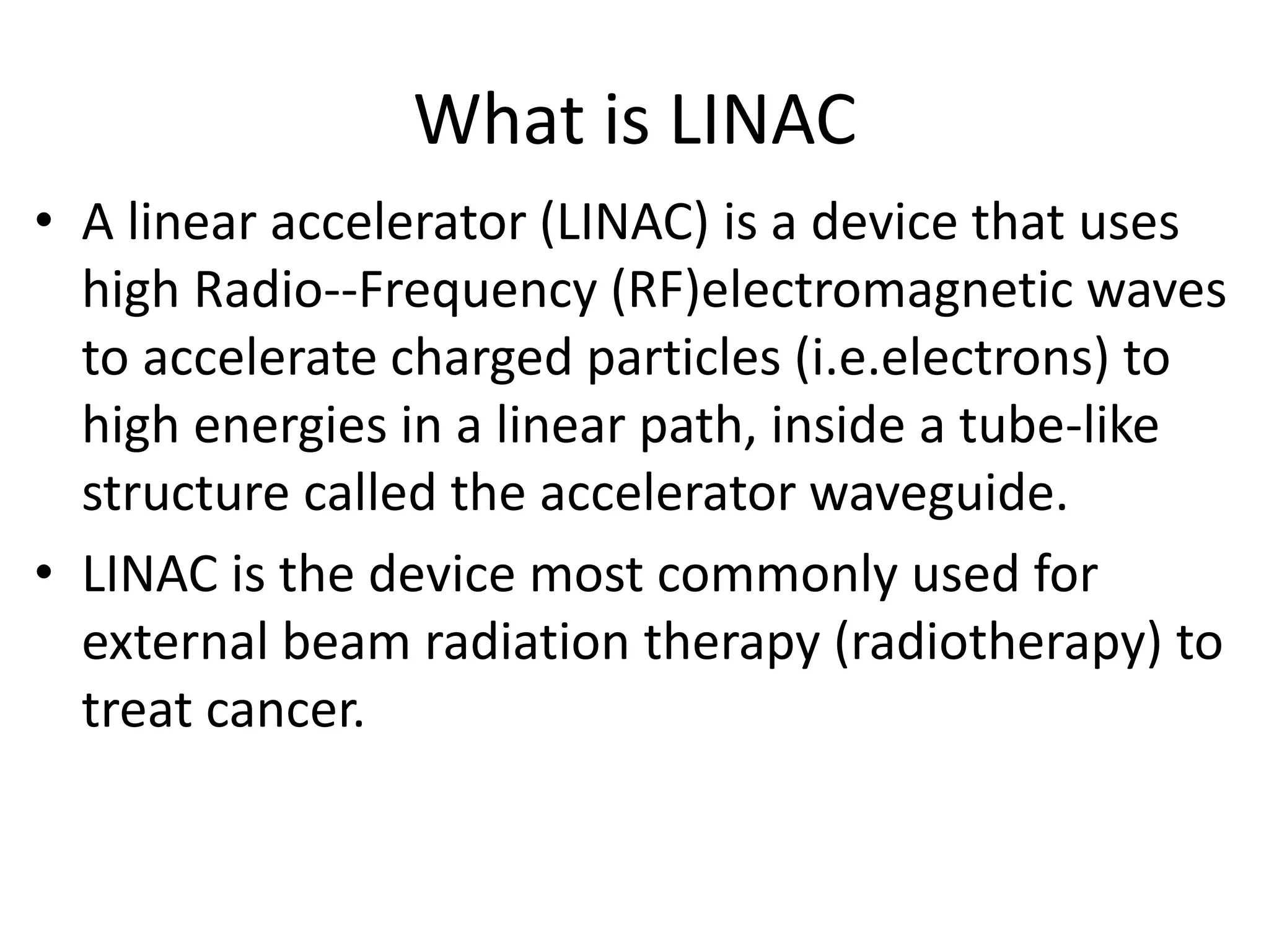 A linear accelerator (LINAC) is a device that uses high-frequency electromagnetic waves to accelerate electrons to high energies in a linear path inside an accelerator waveguide. LINACs are commonly used for external beam radiation therapy to treat cancer. LINACs work by using microwave technology to accelerate electrons, which are then directed at a target to produce high-energy x-ray or electron beams. The beams exit the machine shaped to the tumor and can be delivered from any angle by rotating the gantry and moving the treatment couch. LINACs are used to plan and deliver targeted radiation treatments to destroy cancer cells while sparing surrounding healthy tissue.