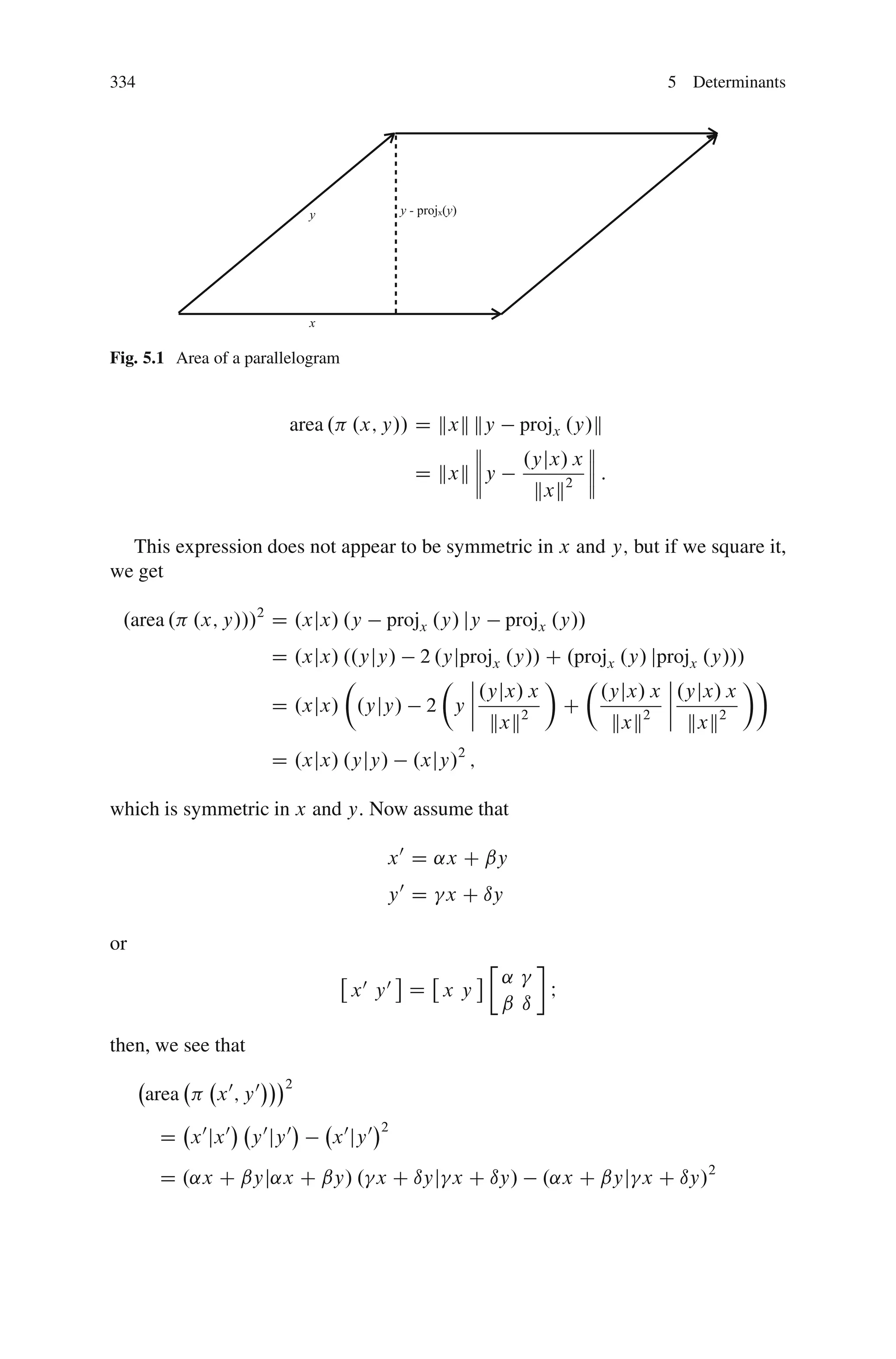 Geometrically, determinants can be thought of as measuring how a linear operator L changes the volume of objects in a vector space V. In one dimension, L must be of the form L(x) = λx, and λ describes how L changes the length of vectors. In two dimensions, the determinant of L is defined such that the ratio of the areas of two parallelograms is not dependent on the choice of vectors or inner product used to compute the areas.