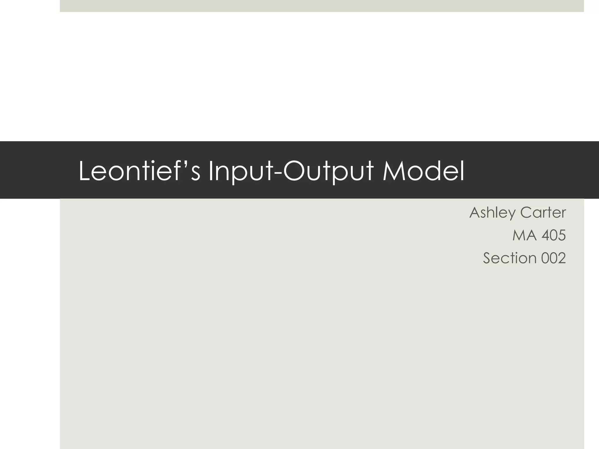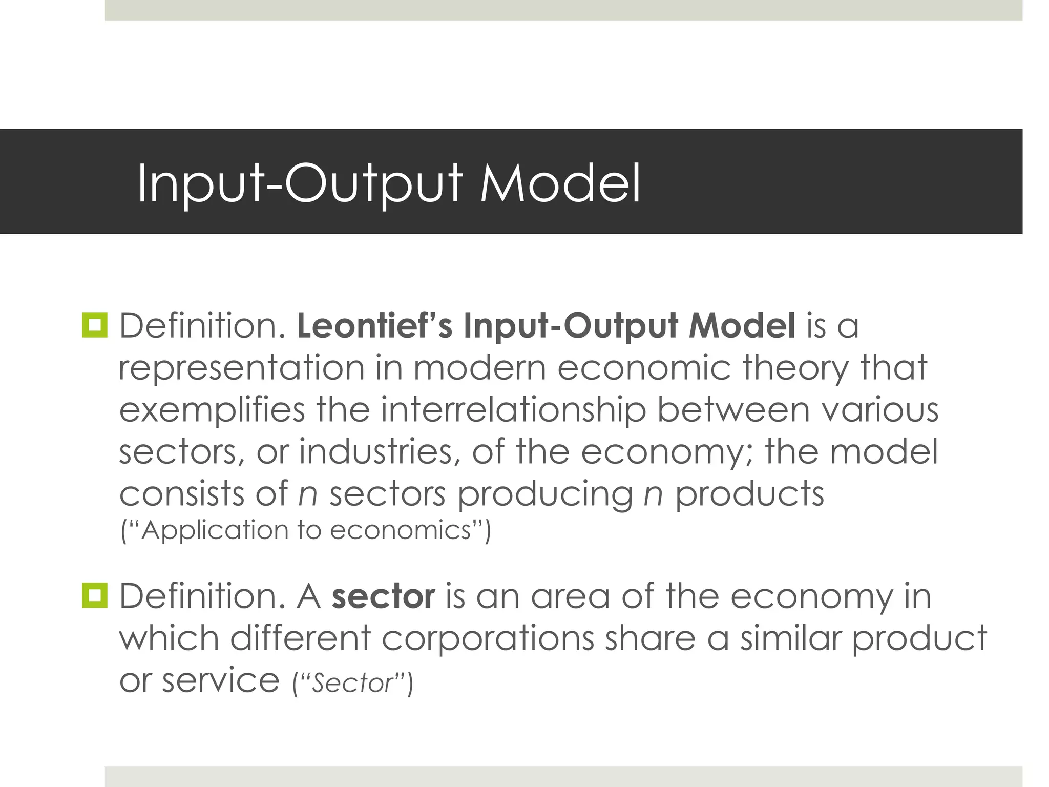 The document summarizes Wassily Leontief's input-output model, which represents interrelationships between economic sectors. It defines sectors as areas of the economy with similar products/services. Leontief divided the US economy into 500 sectors. The model aims to equalize production and demand using matrix algebra. It can be formulated as an open model, which includes external demand, or closed, which ignores demand. The consumption matrix represents input needs per unit of output. Unique solutions for production can be found by manipulating the model's equation. Examples demonstrate applying the open and closed models.
