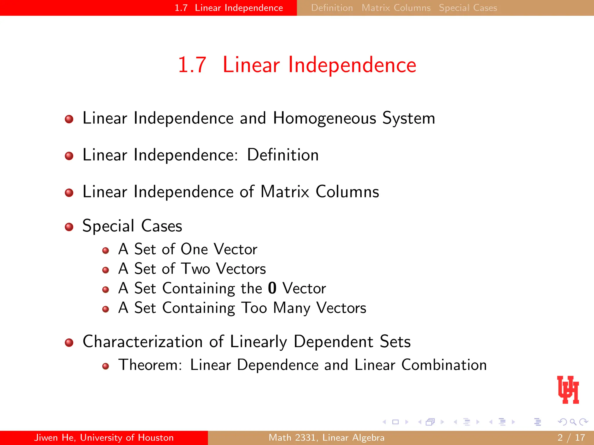 This document discusses the concept of linear independence in linear algebra, defining it in relation to vector sets and their solutions. It explains scenarios of linear dependence and independence through examples, theorems, and matrix representations. The document emphasizes that a set is linearly dependent if it contains too many vectors or the zero vector, and provides methods for determining the independence of given vector sets.
