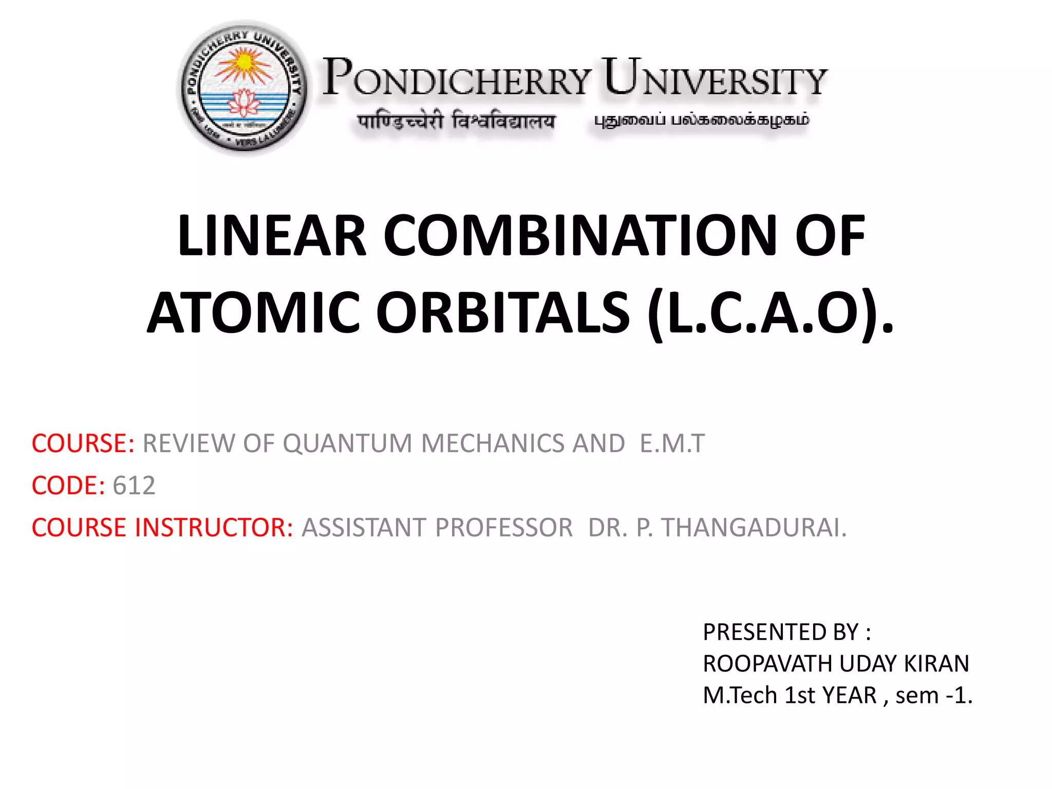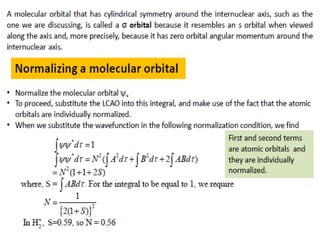 The document discusses linear combination of atomic orbitals (LCAO) in molecular orbital theory. It explains that the overall wave function of an electron in atomic orbitals of different atoms is a superposition or linear combination of the atomic orbitals. This linear combination of atomic orbitals forms an approximate molecular orbital called an LCAO-MO. The lower energy LCAO-MO is a bonding orbital, while the higher energy one is an antibonding orbital.