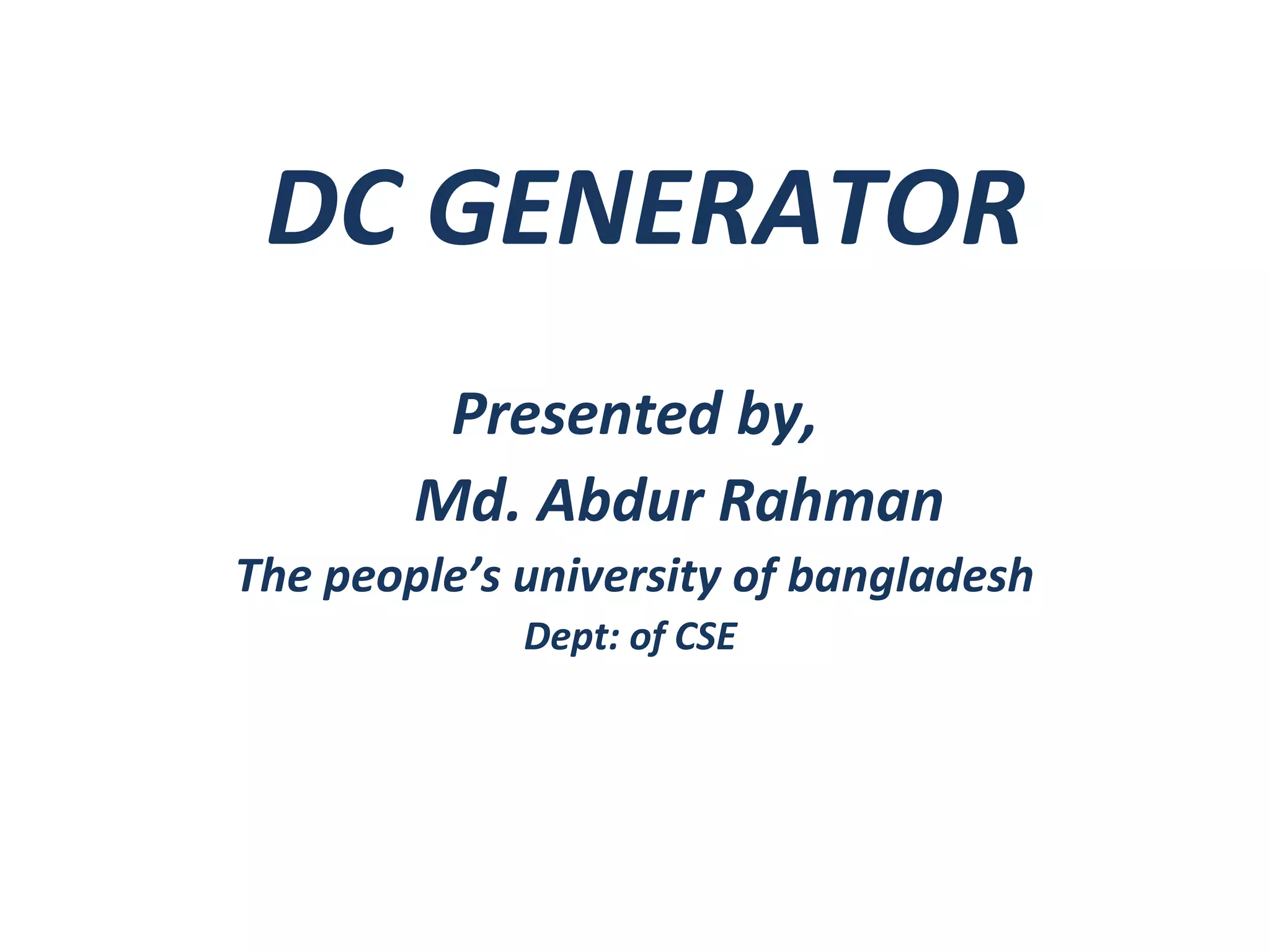 The document provides an overview of DC generators, detailing their function as machines that convert mechanical energy into electrical energy. It covers the working principle based on electromagnetic induction, the various parts and classifications of DC generators, and their applications in different scenarios such as electroplating and battery charging. Additionally, it outlines the construction of a DC generator and includes a thank you note at the end.