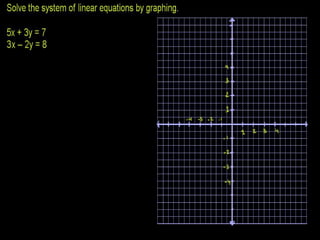 This document discusses methods for solving systems of two linear equations with two unknown variables. It explains that a system of two linear equations can be represented graphically by finding the point of intersection between the lines defined by each equation. Algebraically, there are three main methods covered: elimination by substitution, elimination by equating coefficients, and cross-multiplication. An example using the substitution method is worked through step-by-step to find the solution (3, -2).