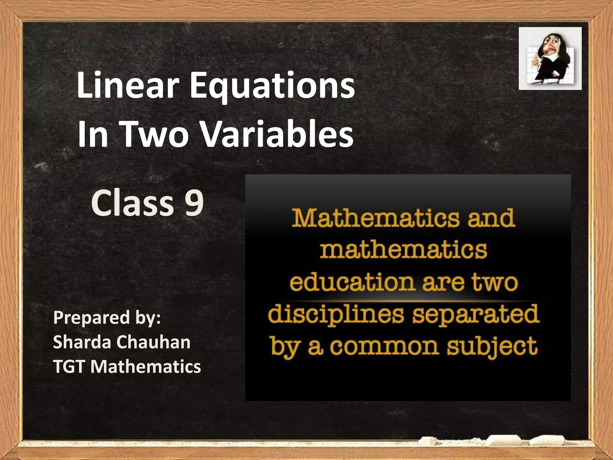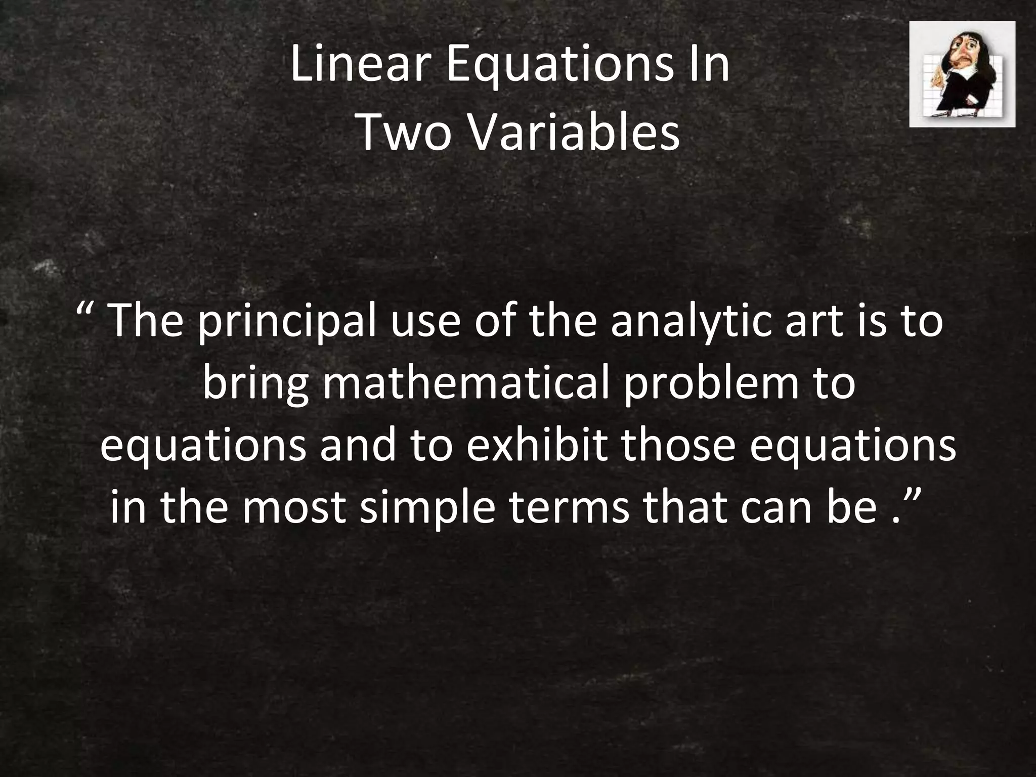 - The document discusses linear equations in two variables. It defines linear equations and explains that a linear equation in two variables can be written in the form ax + by = c.