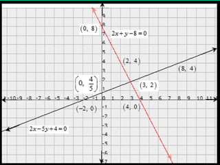 The document discusses systems of linear equations and methods for solving them. It defines a system of linear equations as a pair of linear equations in two variables. It presents two examples of systems of linear equations. It then describes algebraic methods for solving systems, including elimination by substitution, elimination by equating coefficients, and cross multiplication. It provides examples of using elimination by substitution and elimination by equating coefficients to solve systems of two equations with two unknowns.