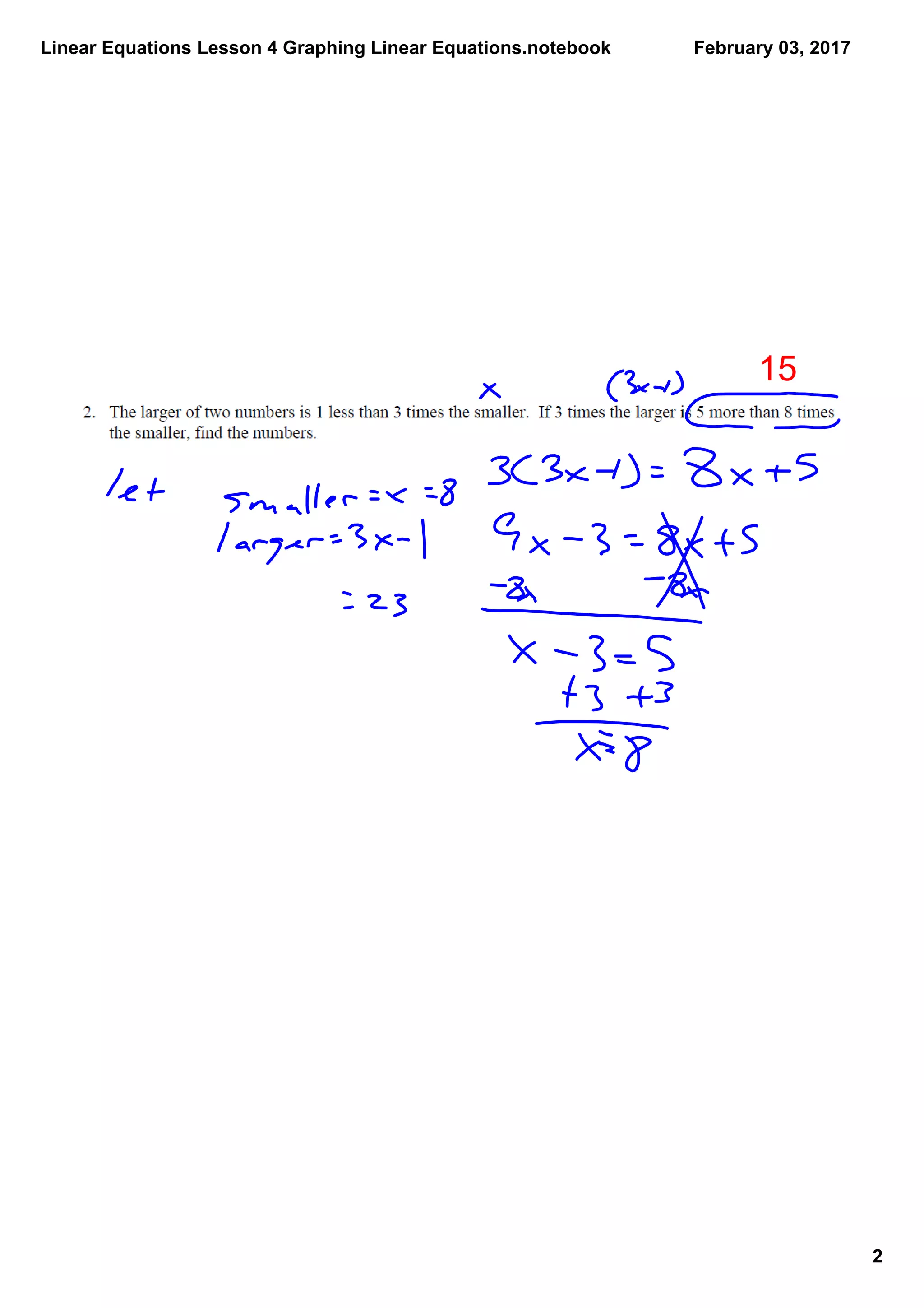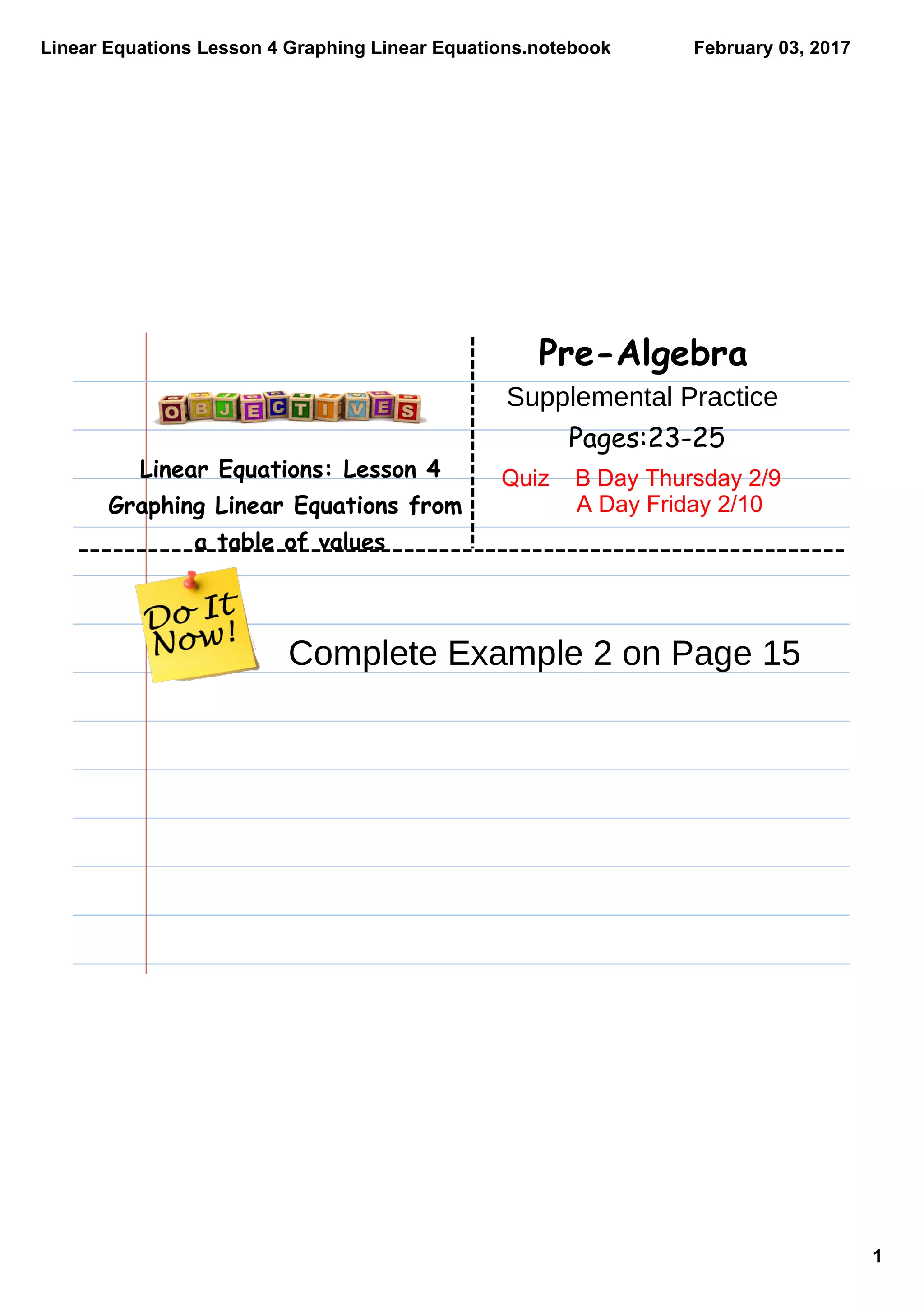 This document outlines a lesson on graphing linear equations from tables of values. It provides instructions to complete example 2 on page 15, and schedules supplemental practice and a quiz for the following Thursday and Friday to reinforce the concepts taught in the lesson.